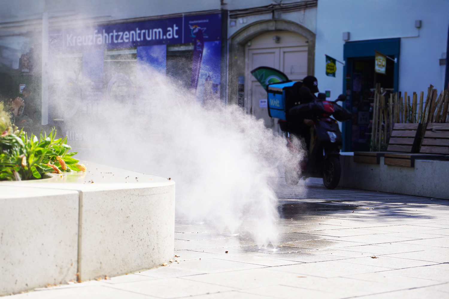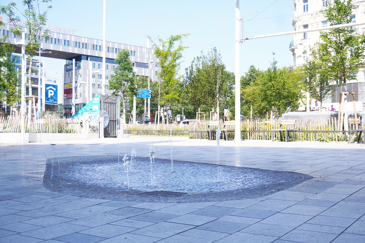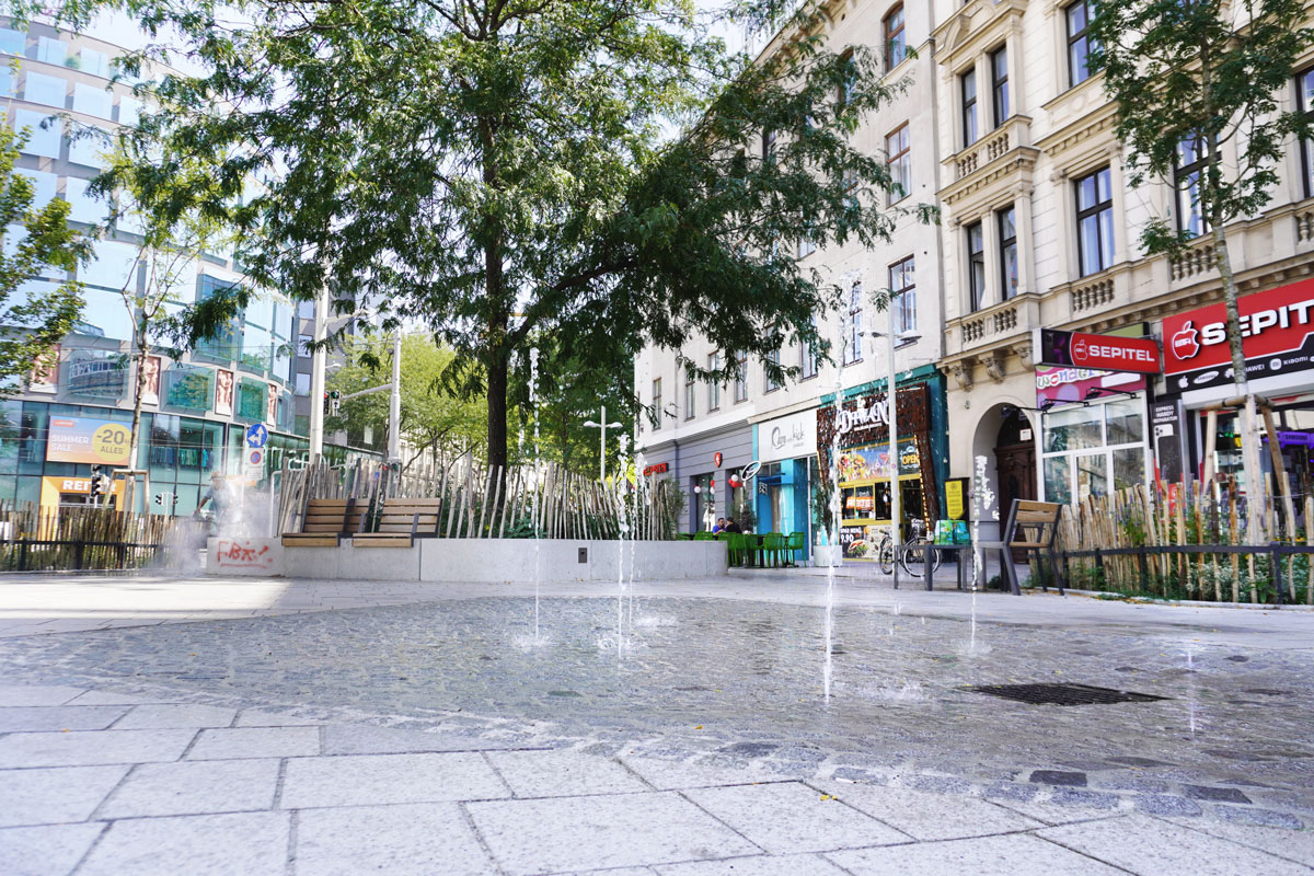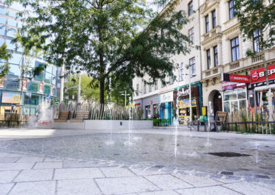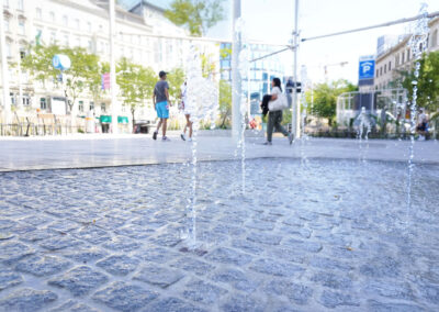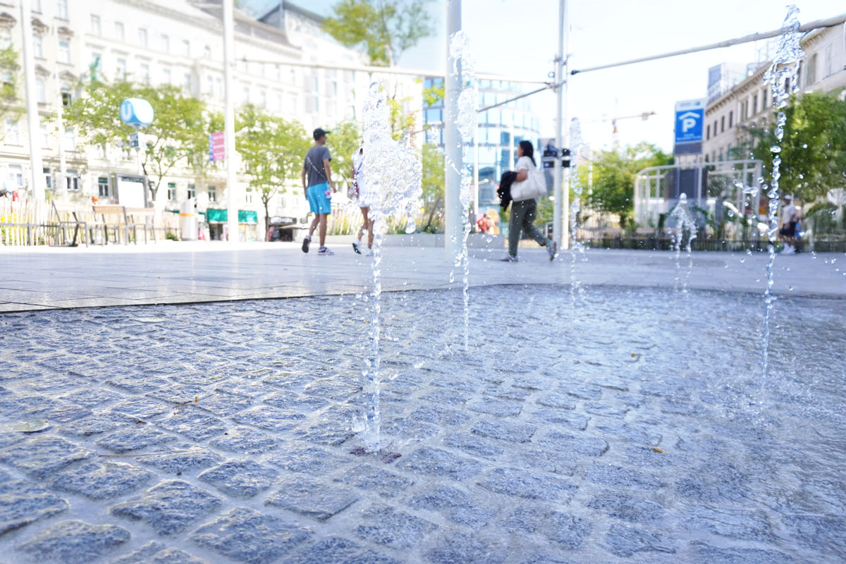Am Christian-Broda-Platz kommt Wasser nicht dekorativ, sondern gezielt und differenziert zum Einsatz: Die Kombination aus Wasserspielen und hochdruckbasiertem Bodennebel sorgt für unterschiedliche Wirkung und Nutzung.