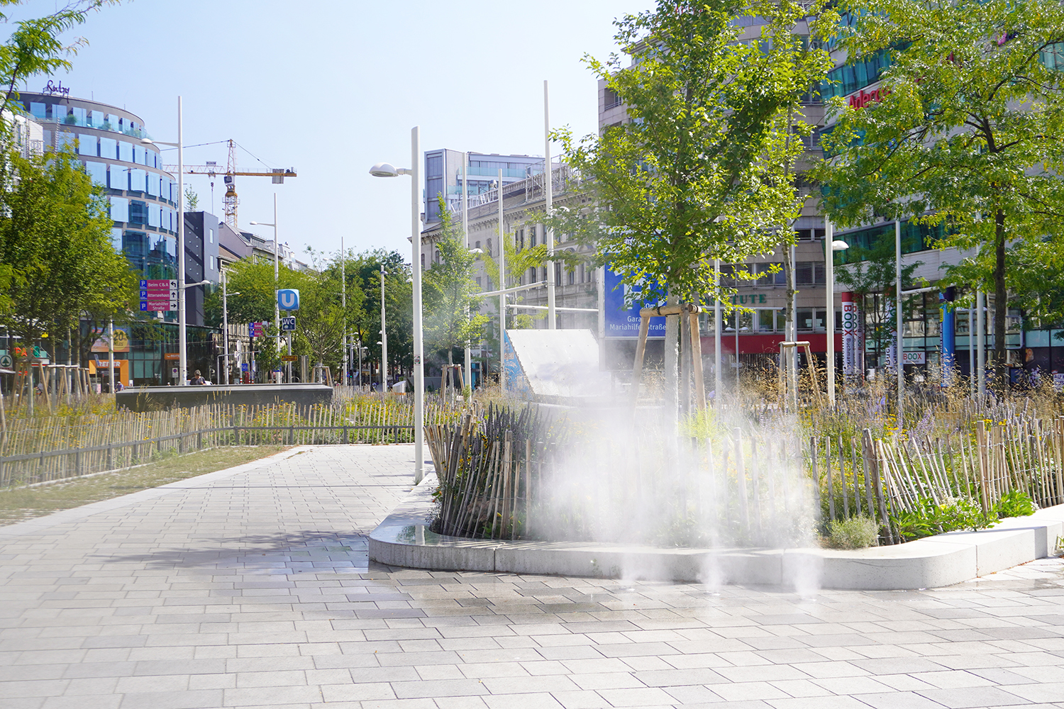 Im Gegensatz zu den Wasserspielen entsteht hier ein sehr feiner Nebel, der die Umgebungsluft abkühlt, ohne Flächen sichtbar zu durchnässen. Die Wirkung ist subtil, aber messbar: Gerade an heißen Tagen verbessert der Bodennebel das Mikroklima entlang der Hauptwege deutlich – beim Vorbeigehen ebenso wie bei einer kurzen Pause.