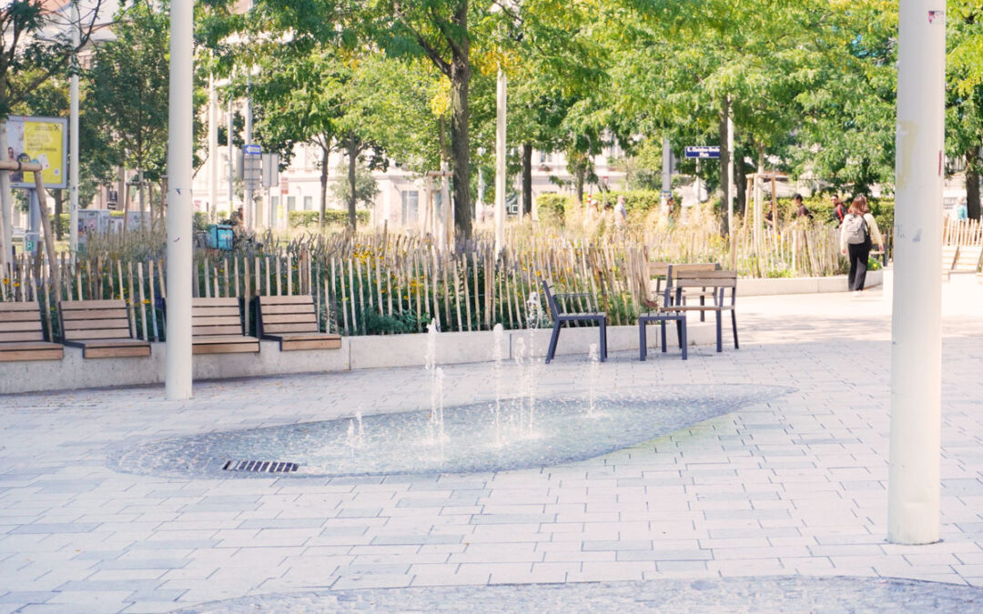 Die „nassen Nebeldüsen“ arbeiten bewusst nicht mit Hochdruck, sondern mit normalem Leitungsdruck. Dadurch entstehen größere Wassertröpfchen als bei klassischen Nebelanlagen. Der Effekt: weniger fein, dafür robuster, sichtbarer und stärker auf direkte Abkühlung und spielerische Nutzung ausgelegt. Die Wasserspiele sind damit bewusst auch als soziale Elemente gedacht – nutzbar, berührbar, intuitiv und verständlich.