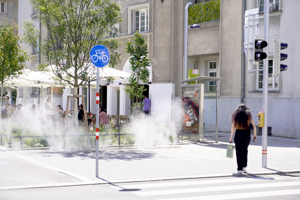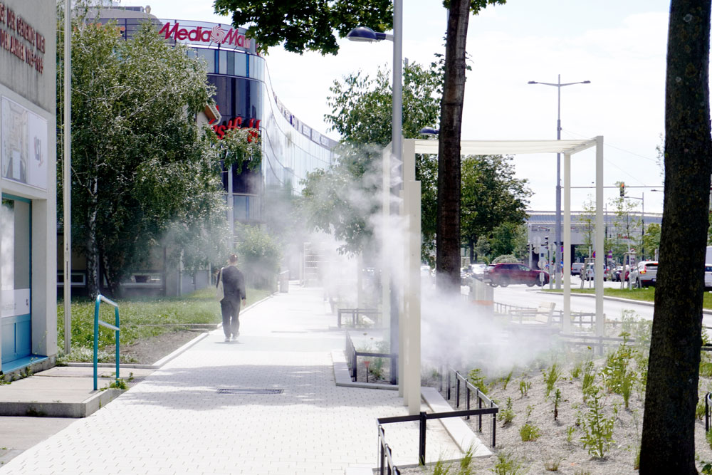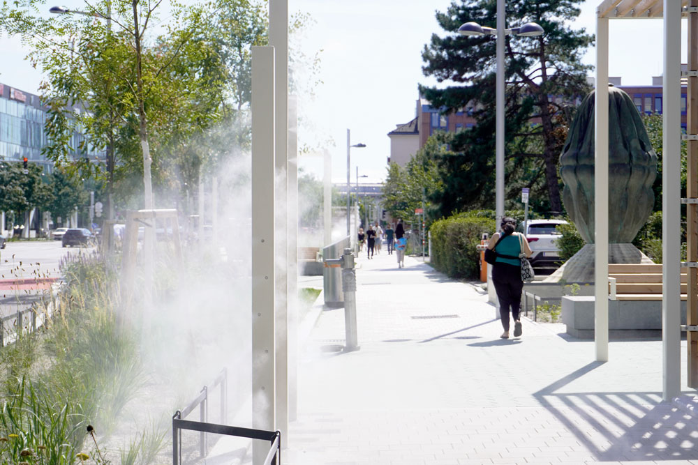 Die Nebelstelen ermöglichen eine unmittelbare Abkühlung beim Vorbeigehen und machen Verdunstungskühlung im Stadtraum direkt erlebbar.