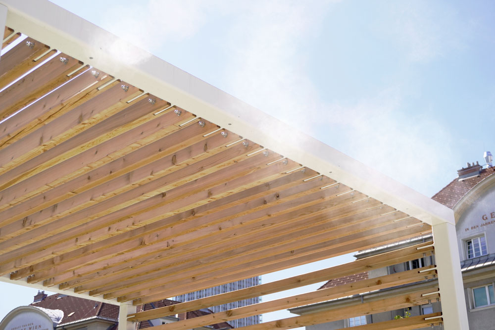 Im Straßenpark wurden insgesamt vier Pergolen errichtet. Jede Pergola ist mit vier oben angebrachten Nebeldüsen ausgestattet. Der feine Wassernebel fällt sanft nach unten und sorgt in Kombination mit der Beschattung für eine angenehme, gleichmäßige Kühlung.