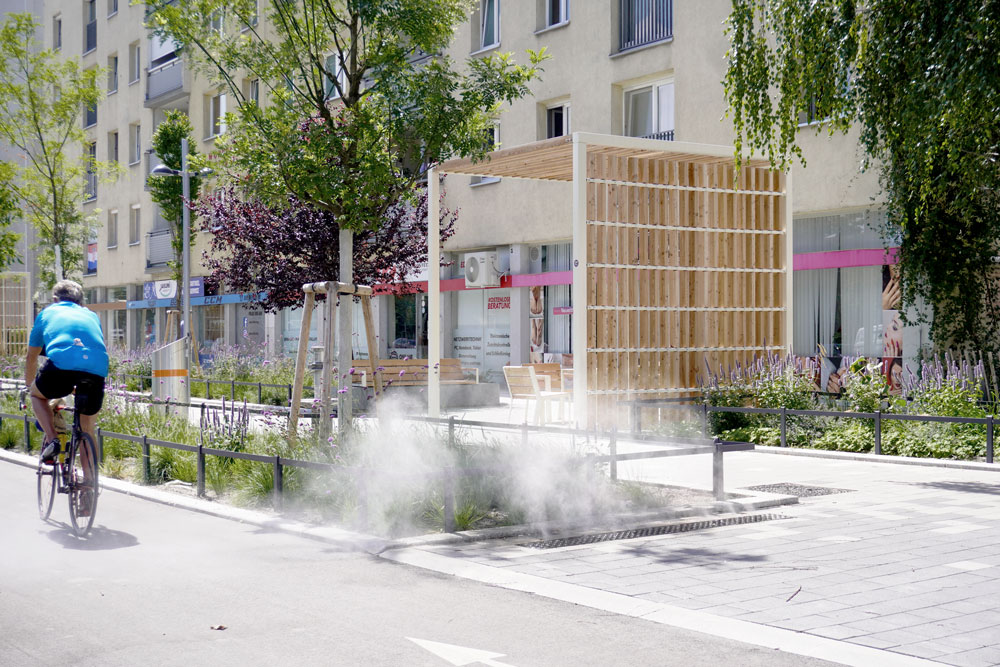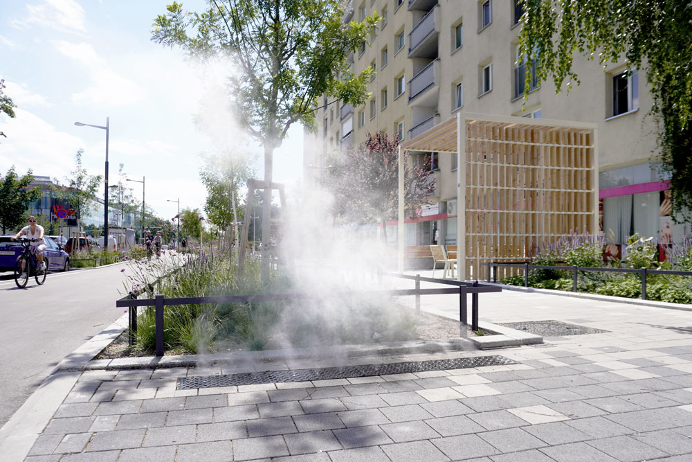Die Kombination aus Beschattung, feiner Verdunstung, Bodennebel und Wasserelementen schafft ein vielschichtiges System zur Stadtkühlung, das funktional wirksam ist und sich selbstverständlich in den öffentlichen Raum integriert. Der Straßenpark an der Wagramer Straße zeigt, wie technische Lösungen zur Klimaanpassung gleichzeitig Aufenthaltsqualität, Nutzungsoffenheit und Gestaltung vereinen können.