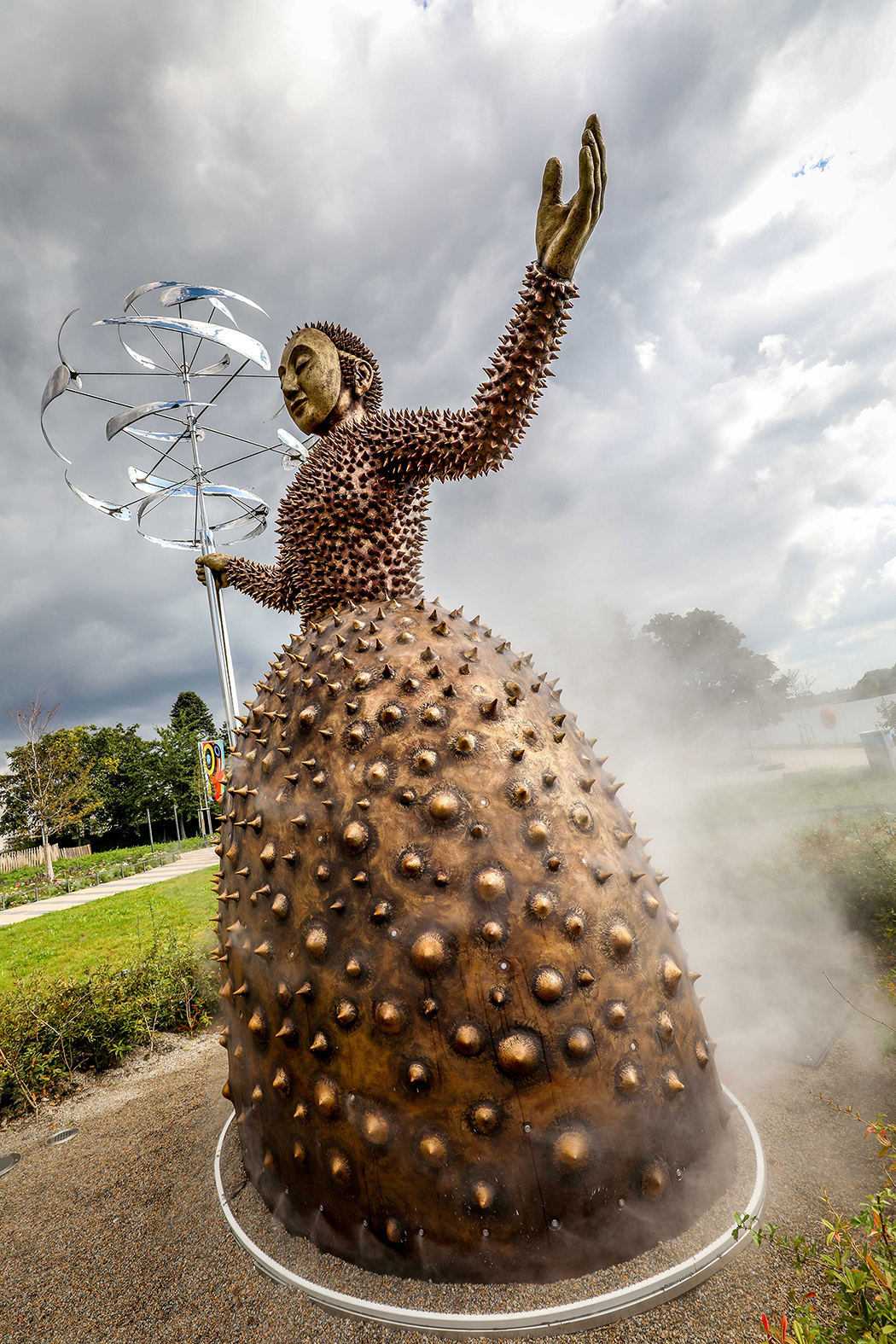 Besonders eindrucksvoll: Ein kunstvolles Nebelspiel – made by Raintime – inszeniert die Skulptur; sichtbar sowohl vom Wasser als auch vom Park aus. Die technische Umsetzung übernahm Hüttinger Interactive Exhibitions. Für die Wasserwächterin entwickelte Raintime eine technisch anspruchsvolle Lösung, die neue Maßstäbe in der Nebelsteuerung setzt.