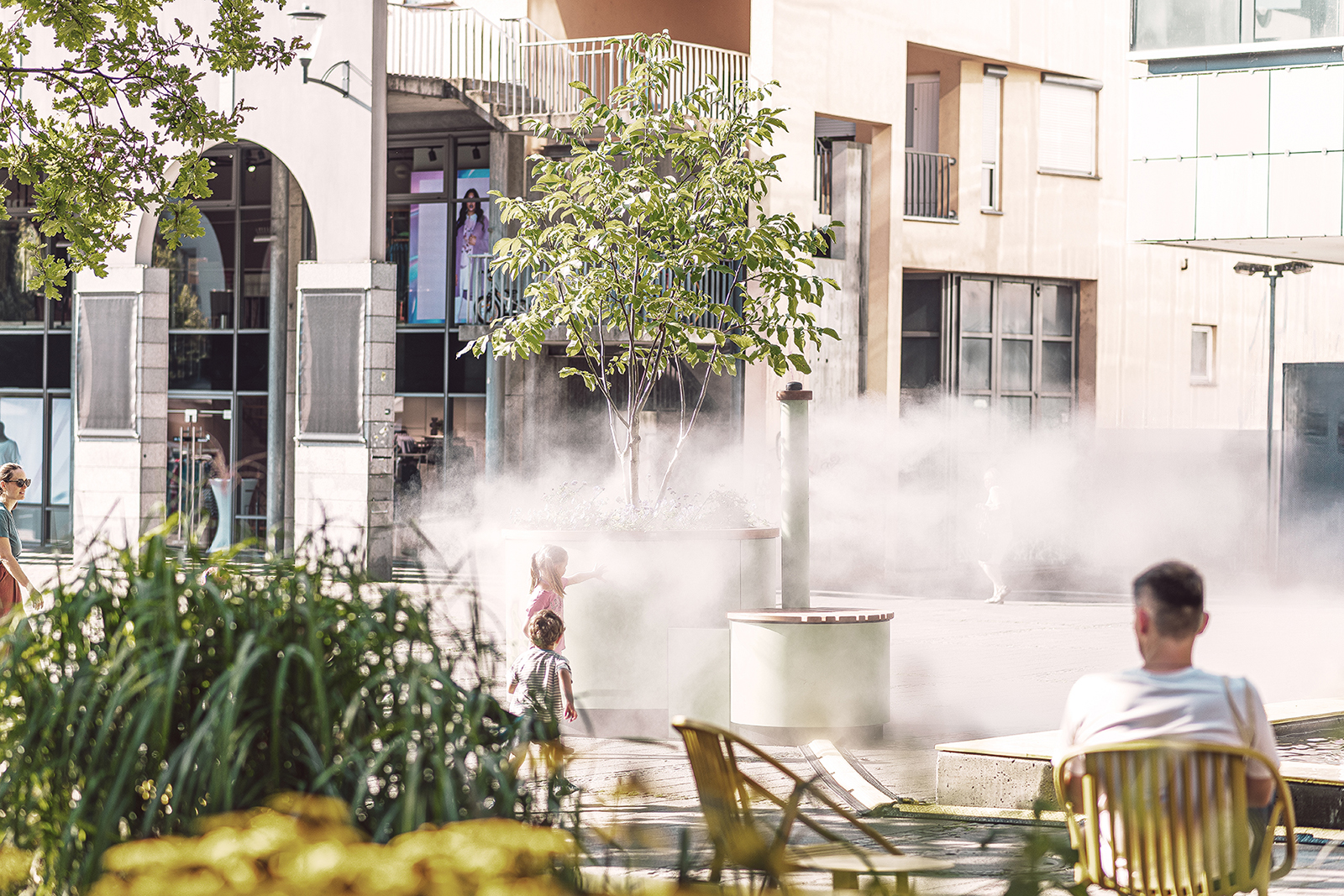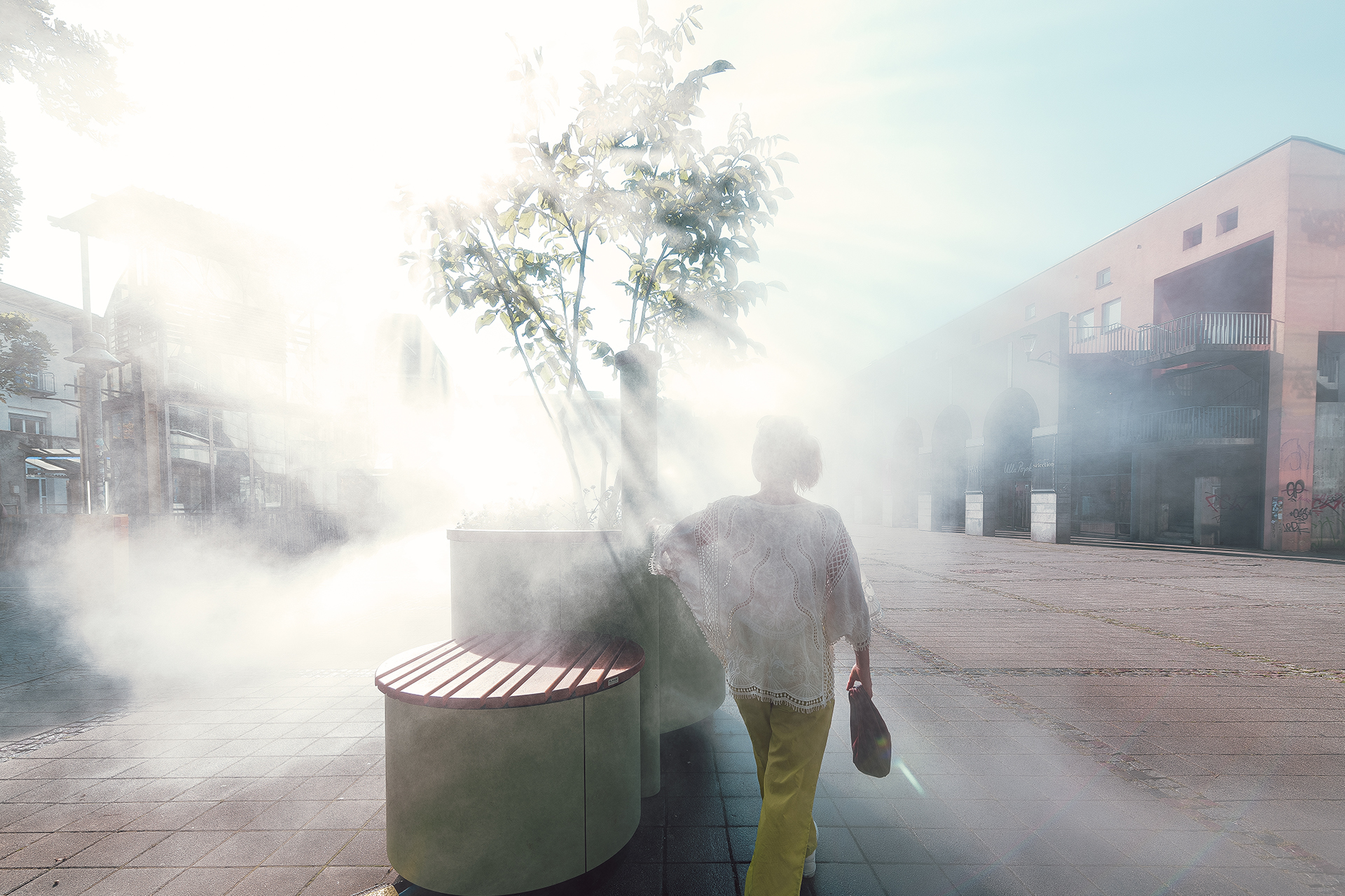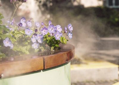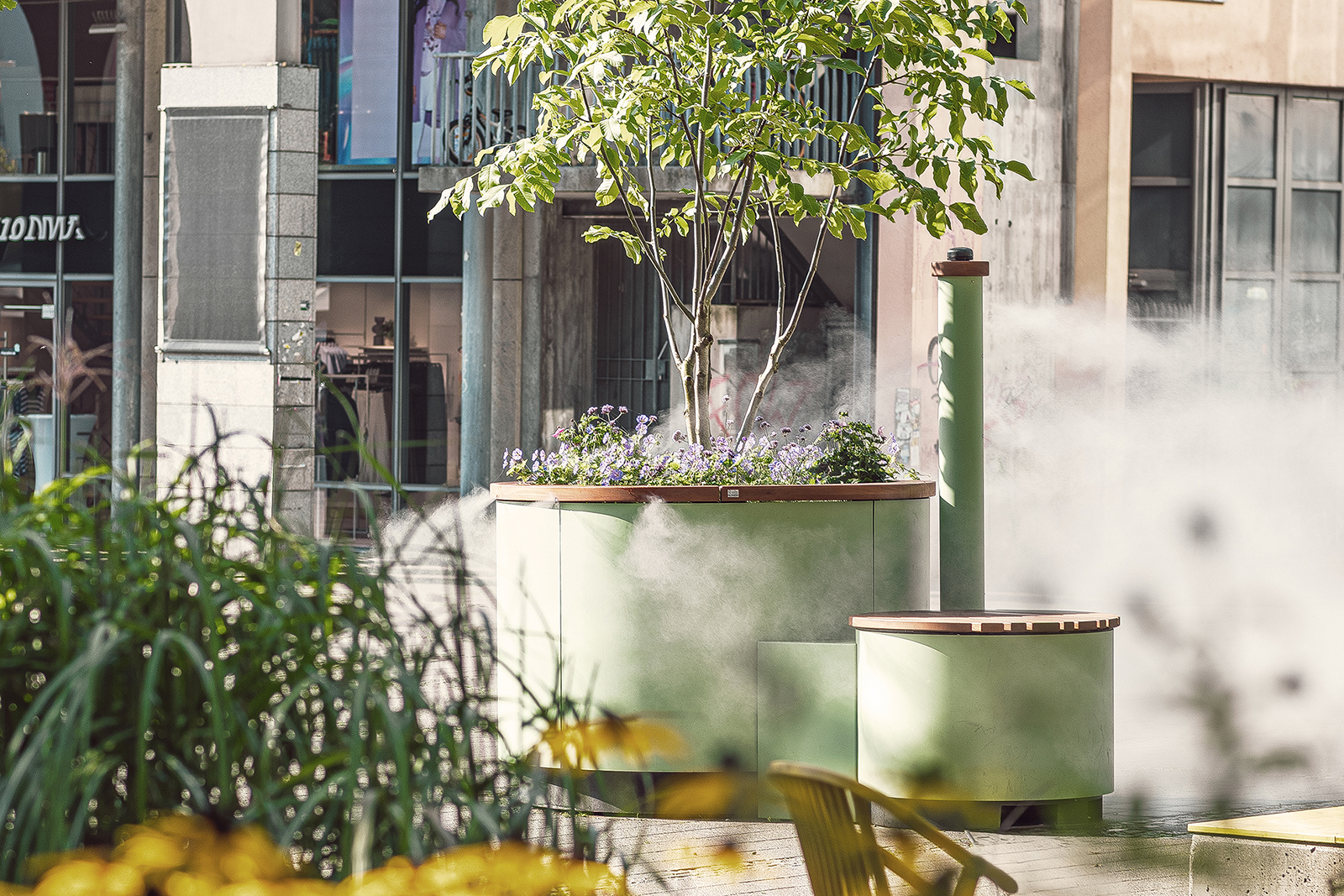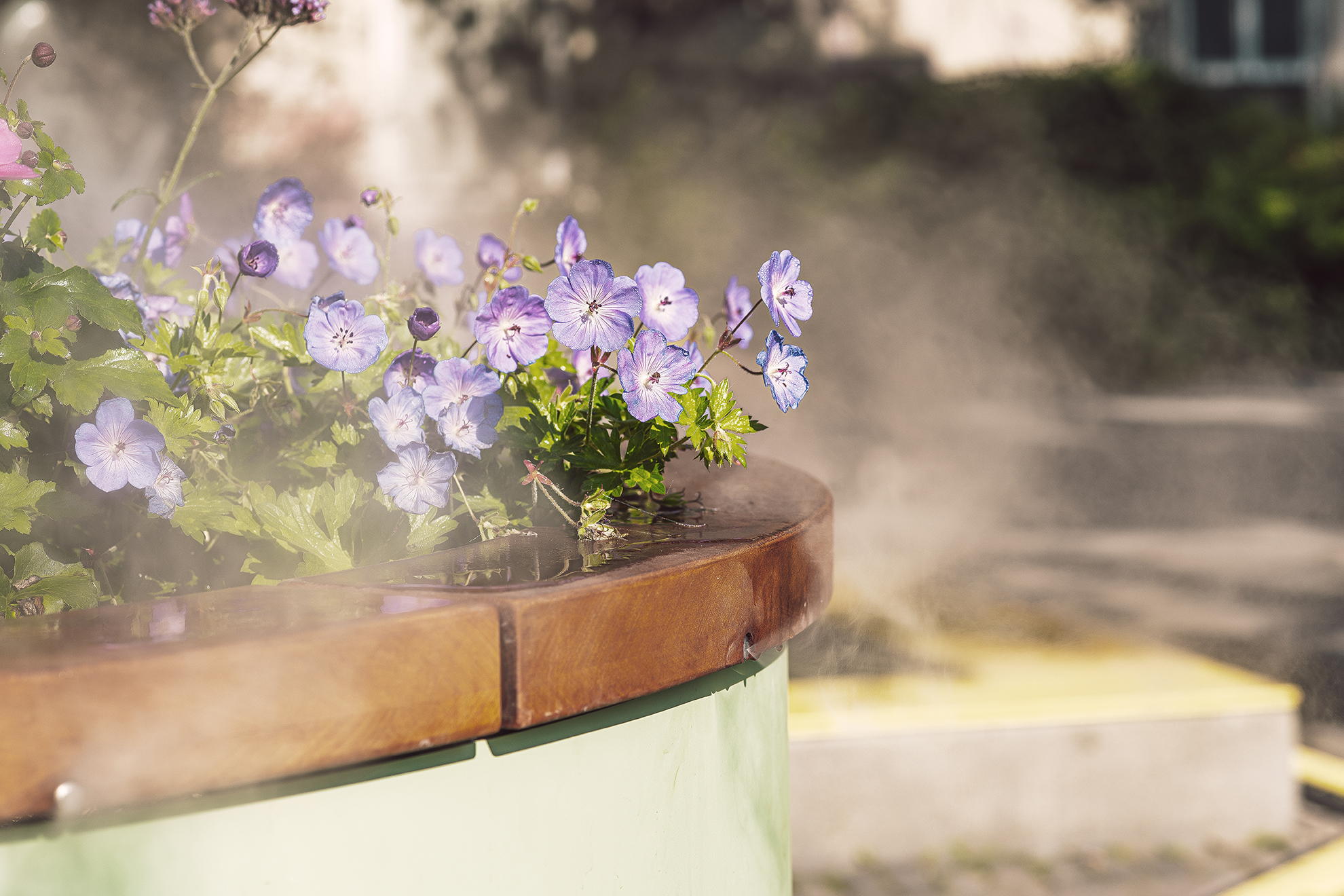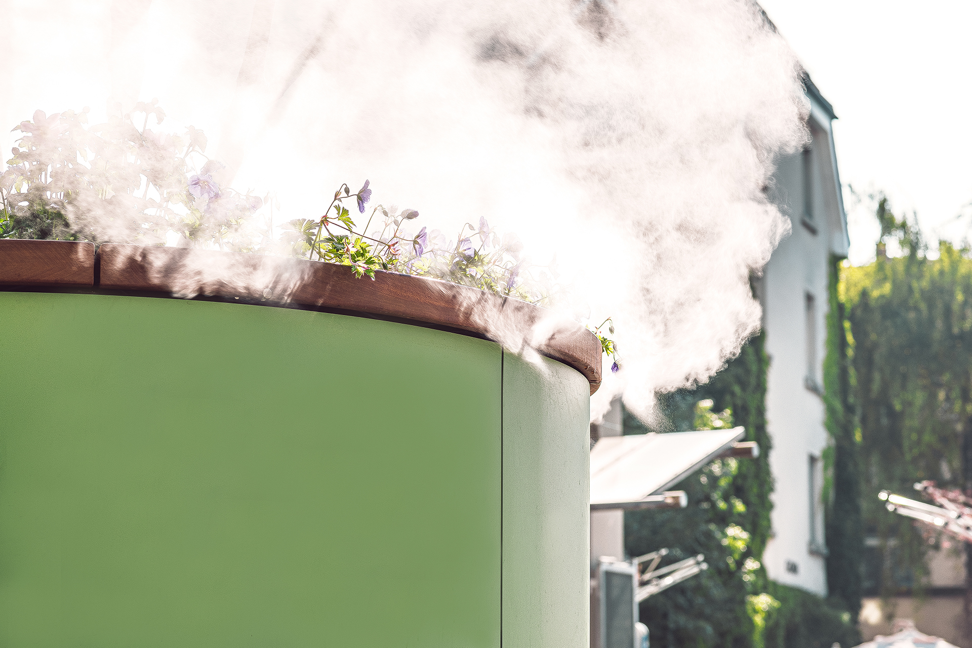 Im Holzring des Pflanzkübels sind neun Düsen integriert, die einen feinen Nebel erzeugen. In der angebauten Säule befinden sich weitere sechs Düsen, von denen eine bewusst tiefer positioniert ist, damit auch Kinder und Hunde erfrischt werden können. Die Technik ist im angeschlossenen Element untergebracht, das direkt mit dem Pflanzkübel verbunden ist und zugleich als Sitz- und Liegefläche dient.
